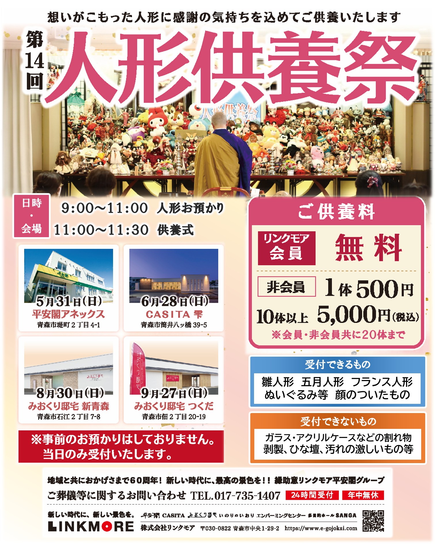 続きを読むリンクモアでは人形供養祭を実施し、役目を果たした人形に対し感謝と愛着を込めてお別れをし、寺社などでお焚き上げをするサービスを定期的に行っています。 次回の開催も予定しておりますので、よろしくお願いいたします。 投稿者:K