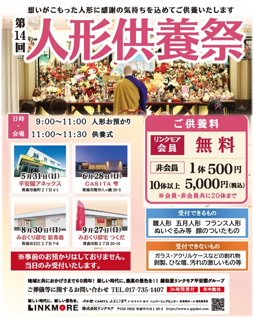今年は第14回を迎え、R8年5月31日、6月28日、8月30日、9月27日に人形供養祭を実施します。