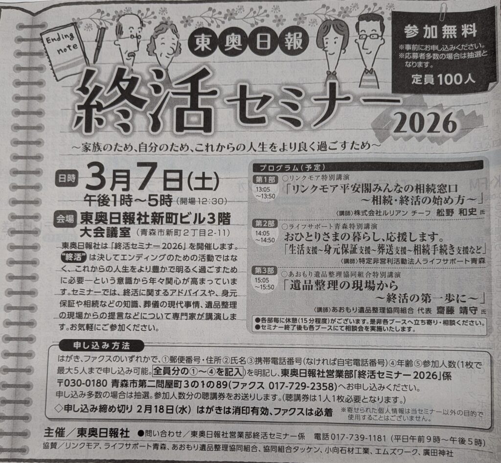 はじめませんか 終活!リンクモア平安閣グループは、2014年以来初回から参加して、今回で12回連続出場であります。今回のテーマは「リンクモア平安閣みんなの相続窓口」。出番は、一番最初の講義になります。人生の終わりを見据えて、普段は伝えられなかった家族や親族への感謝、さらに喜び・悲しみを分かち合ってきた大切な人たちとの思いを心に刻み形にする「終活」。平均寿命の延伸に伴い、長くなった人生を楽しく快適に過ごしてもらおうと終活をサポートする県内企業の取り組みを紹介します。