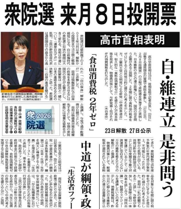 高市首相は、大儀無き解散総選挙に打って出て、国民の信を問うとは言うものの、所詮は国民のためじゃなく自分だけ。自民党はもはや自滅党。解党して膿を出して再生するしかないと思います。派閥でカネと政治の権化のような老獪な議員が仕切っているようじゃ、自民は自浄できないでしょう。政治改革では、存在感を喪失した参議院廃止、少子化に対応した国会議員定数3分の1に。できれば二大政党制で大統領制に。75歳定年制導入。世襲議員廃止、官僚天下り禁止、政治献金はいかなる性質であっても禁止、できれば公約に基づく成果報酬を導入。これくらいの改革をしないと国民は本気度を感じないでしょう。今の政治に創造的破壊を求めます。あきらめるな!すごいことを成し遂げるには時間がかかるのだから…。Never give up, great things take time.