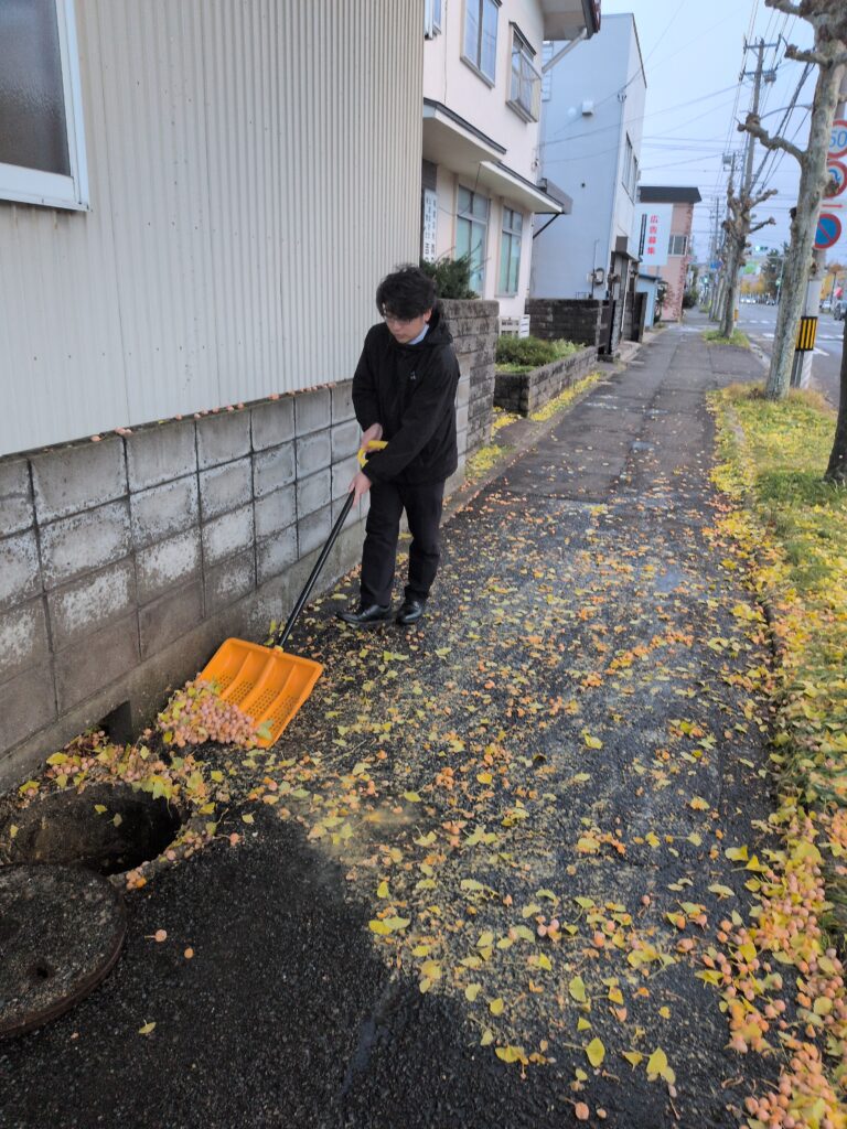 毎年秋になるとアネックスの前のイチョウの木が沢山実をつけます。食べると美味しいですが果実の部分が独特な匂いがしますね。雨が降ったり歩行者が通ったりすると潰れて汚れるので、歩道に落ちている分を清掃しています♫