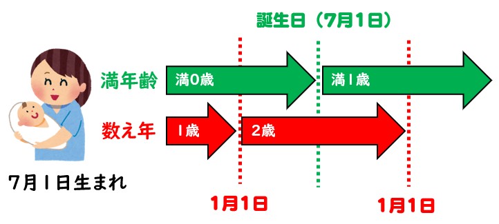 一方で満年齢というものがありますが、自分が生まれてから何年が経過したかを表す年齢・数え方で、生まれた時点で0歳とカウントし、誕生日を迎えるごとに1歳ずつ足していき、計算する方法です。